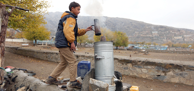 فتى أفغاني يجهز الشاي استعداداً لاستقبال الزبائن في تخوم العاصمة كابول.