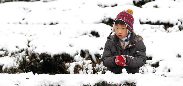طفل يستمتع بمنظر الثلج بمزرعة شاي في جبال بينغلين بمدينة تايبيه الجديدة في تايوان.