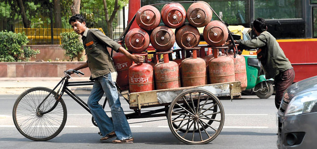 مزارعان هنديان يستعينان بعربة تقليدية، لحمل قارورات الغاز في شوارع نيو دلهي. وتتعرض الهند حالياً لضغوط من أجل إصلاح نظام الضرائب، ووضع تدابير لتعزيز النمو.