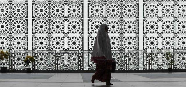 امرأة في طريقها لأداء صلاة التراويح في مسجد «توانكو ميزان زين العابدين» في مدينة بوتراجايا. وتعمر حشود المصلين المساجد المنتشرة في أنحاء المدينة الماليزية خلال ليالي شهر رمضان المبارك.