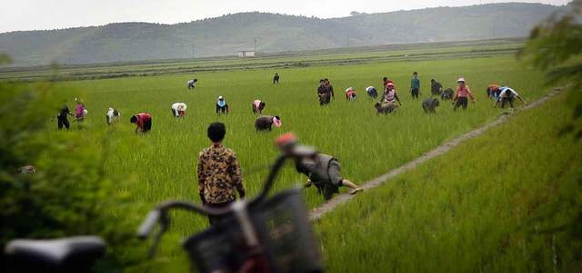 رجال ونساء يعملون في حقول الأرز بمقاطعة كانغون، في كوريا الشمالية، وتهدف السلطات إلى جعل المنطقة وجهة سياحية لسكان المقاطعات الأخرى، خلال موسم الصيف.