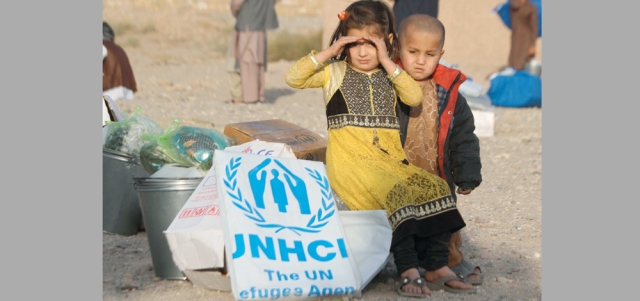 طفلان يتلقيان المساعدات الإنسانية، التي توفرها المفوضية السامية للأمم المتحدة لشؤون اللاجئين، في ضواحي مدينة هرات الأفغانية. وقد نزح آلاف المدنيين من مناطق «غور» و«فيرياب» و«بغديس»، بسبب غياب الأمن والفقر.