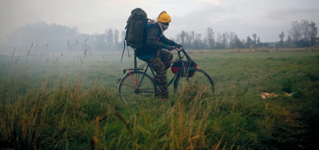 مهاجر يقود دراجة هوائية بعد ترحيل اللاجئين من مخيم «الغابة» في كاليه الفرنسية. واستمرت إزالة المخيم ثلاثة أيام وتم نقل المهاجرين غير الشرعيين للإقامة في مراكز استقبال خاصة في أنحاء متفرقة من البلاد.