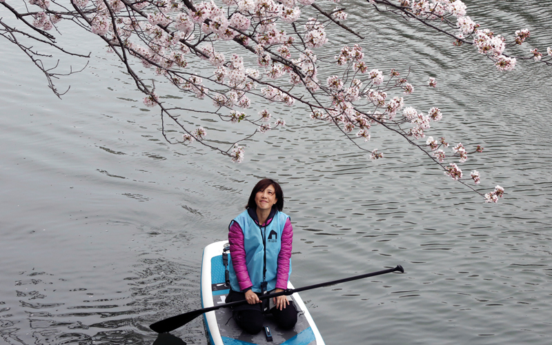 امرأة على متن قارب صغير تتأمل أزهار الكرز، على طول نهر «أوكا»، في منطقة يوكوهاما اليابانية.