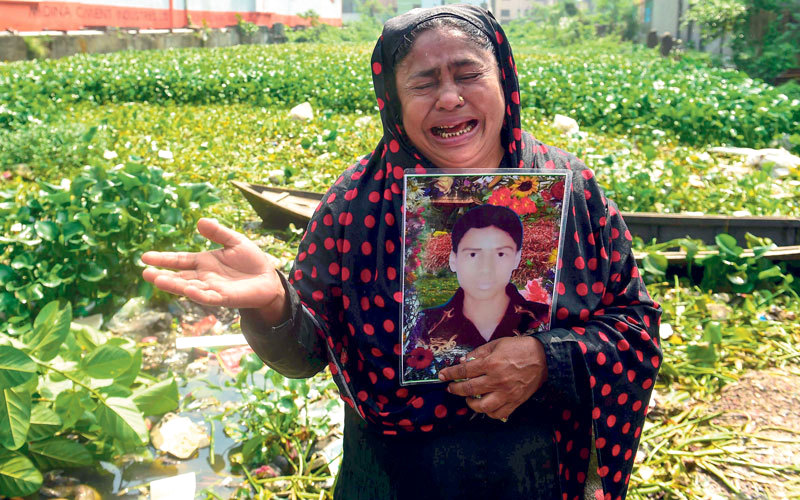 أم تبكي بينما تحمل صورة لابنها الذي لا يزال مفقوداً بعد انهيار مبنى «رنا بلازا»، في العاصمة دكا. وصادف أمس الذكرى الرابعة للحادث. ونظم آلاف عمال الملابس في بنغلادش تظاهرة أمس، بمناسبة الذكرى السنوية الرابعة لكارثة انهيار المصنع التي أسفرت عن مقتل 1338 شخصاً، مطالبين بإنصاف الضحايا ودفع أجور أفضل.