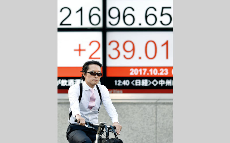 فوز ساحق رجل يمر بلوح لمؤشر سوق الأسهم في طوكيو. وفي أعقاب حصول رئيس الوزراء الياباني شينزو آبي على فوز ساحق في الانتخابات، ارتفع مؤشر نيكاي ليحقق مكاسب قياسية على مدار اليوم الخامس عشر على التوالي.