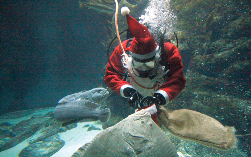 أحد الغواصين يرتدي لباس «بابا نويل»، وهو يفتح كيسه ويوزع الهدايا على الأسماك، التي تعيش في حوض تربية أسماك في تونينغ بشمال ألمانيا.