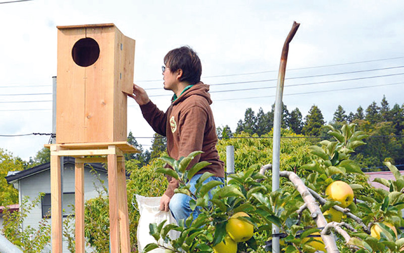 في بستان تبلغ مساحته 2000 متر مربع، في منطقة شيمويوغوتشي هيروساكي، صنع أحد المزارعين صندوقاً لتعشيش البوم، مدعوماً بأرجل طولها متران، حيث يرتفع لعلو أطول من أشجار التفاح المحيطة به. وعلى الرغم من أنه شاغر حالياً، فإن المزارع، تشيكاغ إشيوكا، 35 عاماً، يقول «سوف يأتي البوم في الربيع، لتربية صغاره هنا».