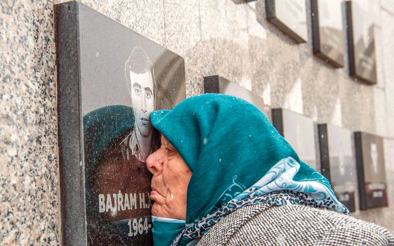 عجوز من كوسوفو تقبل صورة ابنها على لوحة من الرخام، مخصصة لضحايا مجزرة قرية راكاك، التي نفذها الصرب في تسعينات القرن الماضي.