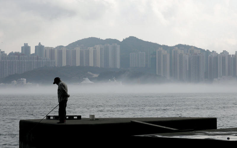 .رجل يقف مقابل مرفأ فيكتوريا في هونغ كونغ الذي تغطى بالضباب الكثيف. ويعد الضباب ظاهرة جوية شائعة في الجزيرة خلال فصل الربيع، يمكن أن تؤثر بشكل كبير على النقل البحري والطيران.
