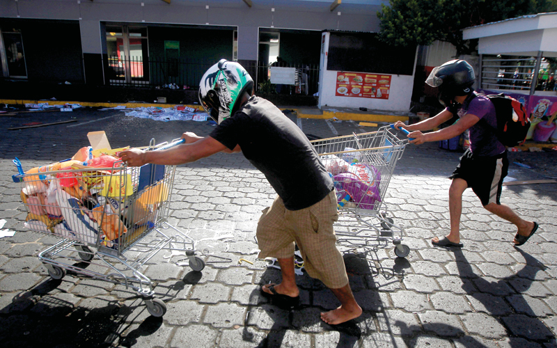 أشخاص ينقلون بضائع تم نهبها من متجر بعد الاحتجاجات على إصلاح خطط المعاشات التقاعدية لمعهد الأمن الاجتماعي بمدينة ماناغوا في نيكاراغوا.