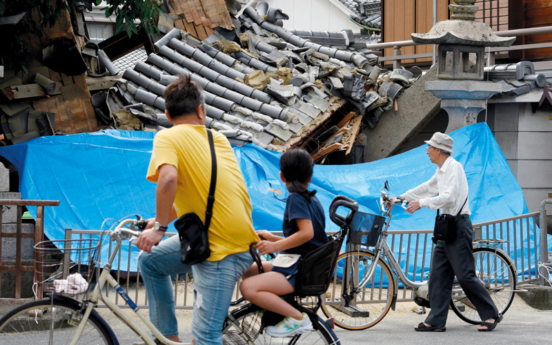 سكان يمرون بجانب بوابة معبد، انهارت بسبب الزلزال الذي ضرب منطقة إباراكي في محافظة أوساكا، غرب اليابان، وأدى الزلزال إلى مقتل ثلاثة أشخاص، وإصابة أكثر من 50 بجروح.