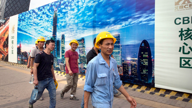 عمال بناء بالقرب من لوحة إعلانات تصور مدينة الأعمال في بكين. وتباطأ النمو الاقتصادي في الصين في الربع المنتهي في يونيو، ما يزيد من التحديات التي تواجه بكين وسط تصاعد التعرفة الجمركية التي فرضتها واشنطن.