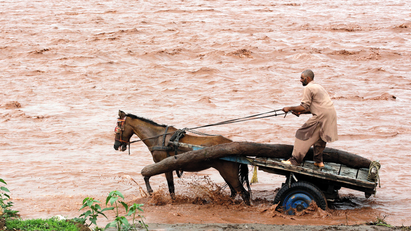 رجل من منطقة غوجار يركب عربة يجرها حصان على ضفة نهر مغمورة بالمياه عقب هطول أمطار موسمية غزيرة على ضواحي مدينة جامو العاصمة الشتوية لمقاطعة كشمير الهندية.