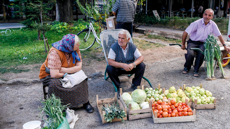 باعة جائلون من صربيا وألبانيا يعرضون فواكه وخضراوات على جانب الطريق في بلدة بريسيفو، جنوب صربيا. وفي وادي بريسيفو الحدودي لا يولي أي من المواطنين الألبان أو الصرب اهتماماً كبيراً للحديث عن التغييرات في الحدود بين صربيا وكوسوفو، لكنهم مشغولون بكسب لقمة العيش.