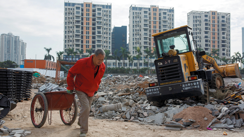 عامل يجرُّ عربة في موقع بناء بإقليم غواندونغ في الصين، حيث يشهد الإقليم طفرة في البناء والتشييد. رويترز