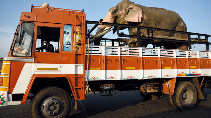 شاحنة تحمل فيلاً بولاية كيرالا بالهند استعداداً لمشاركته في العديد من المهرجانات المقبلة.