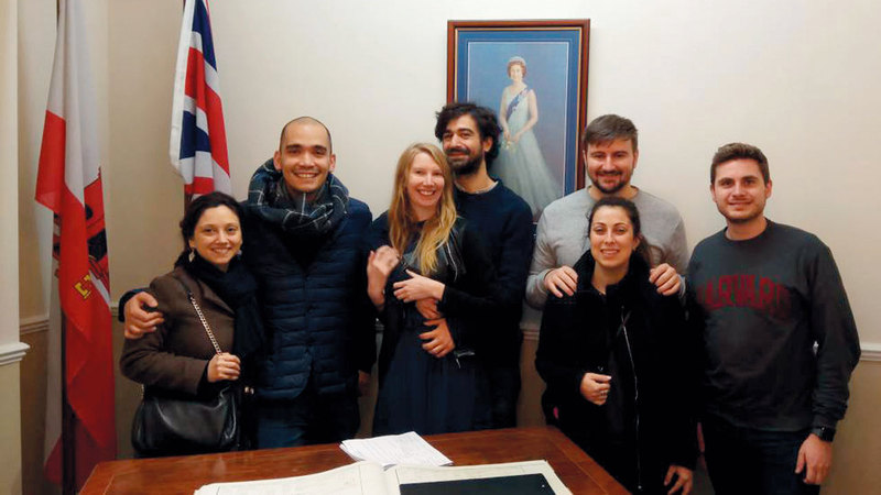 ميليسا وزوجها «في الوسط» إضافة إلى الشهود على زواجهما في جبل طارق. أرشيفية