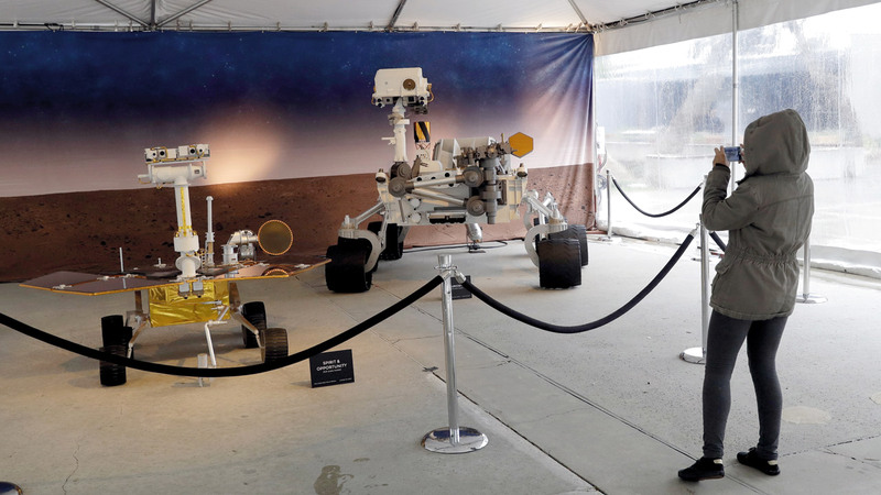 نسختان من مسبار المريخ أوبورتيونيتي وكوريوسيتي تم عرضهما بعد انتهاء مهمة أوبورتيونيتي الفضائية. أ.ب
