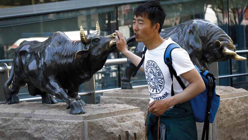 رجل يلامس تمثال ثور معروضاً خارج أحد البنوك في بكين، في وقت تراجعت أسعار الأسهم وأسعار النفط بعد أن هدد الرئيس الأميركي بالمزيد من الرسوم الجمركية على الواردات من الصين، ما أثار قلق المستثمرين الذين توقعوا أنباء طيبة هذا الأسبوع.