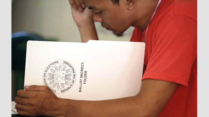 فلبيني يملأ استمارة الاقتراع في مكتب انتخابي بالعاصمة مانيلا. وسيشارك 61 مليون ناخب في الانتخابات النصفية لاختيار نواب غرفتي البرلمان.