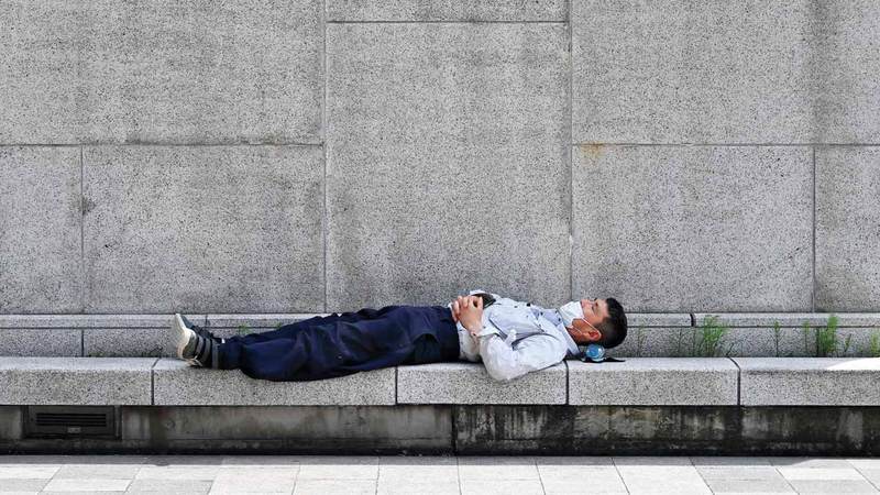 موظف يسترخي على قارعة الطريق خلال استراحة الغداء في حي مارونوشي بالعاصمة اليابانية طوكيو.