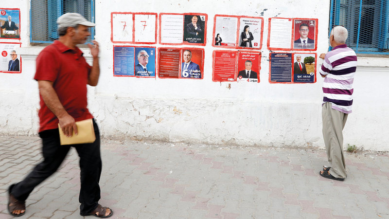 رجل يمر بجانب ملصقات إعلانية لمرشحين للرئاسيات في تونس.