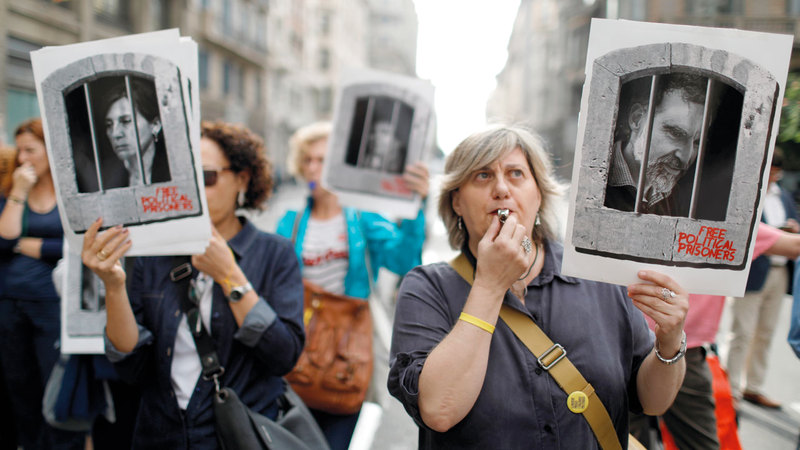 ناشطة تستخدم صافرة وهي تسير عبر شارع «فيا لايتانا»، أثناء احتجاج بعد صدور حكم في محكمة محلية بشأن حظر استفتاء الاستقلال في برشلونة.