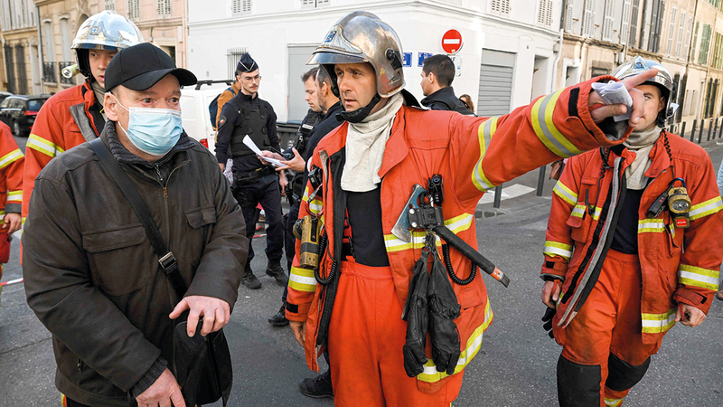 عناصر الدفاع المدني يساعدون سكان بناية انهارت، في مدينة مرسيليا الفرنسية على الإخلاء السريع للمكان.