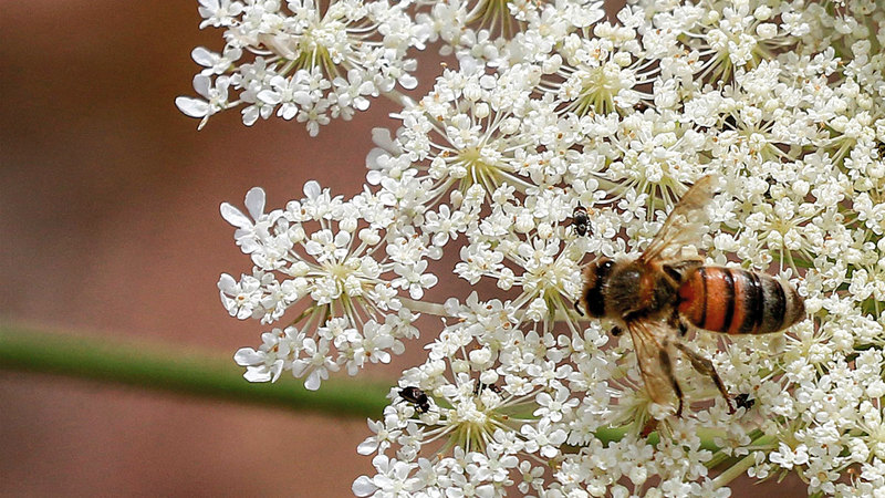 نحلة تجمع الرحيق لصناعة العسل من زهور في إربد شمال الأردن.
