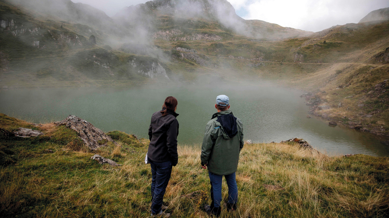 ينظر الأستاذ المتخصص في علم البيئة الجبلية في المعهد الوطني التطبيقي في تولوز ديرك شميلر، وزميلته الباحثة المشاركة في مختبر البيئة والإيكولوجيا الوظيفية التابع للمعهد أديلين لوباو، إلى مياه بحيرة «أريو» في جبال البرانس جنوب غرب فرنسا.
