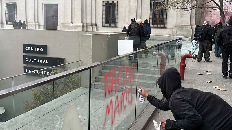 متظاهر يرسم كتابات «غرافيتي» على جدار خارج قصر «لامونيدا» الرئاسي في سانتياغو، قبل أمس، خلال احتجاج لإحياء الذكرى الخمسين للانقلاب العسكري الذي قاده الجنرال أوغوستو بينوشيه، على الرئيس الاشتراكي سلفادور أليندي. واشتبك متظاهرون تشيليون مع الشرطة، وارتكبوا أعمال حرق متعمدة، خلال مسيرة لإحياء ذكرى ضحايا دكتاتورية بينوشيه بعد مرور 50 عاماً على الانقلاب الذي أوصله إلى السلطة. واندلعت مناوشات بين شبان متظاهرين والشرطة خارج القصر الرئاسي، حيث أطيح بالرئيس أليندي آنذاك، في 11 سبتمبر 1973، وعند المقبرة التي تضم نصباً تذكارياً لضحايا نظام بينوشيه الوحشي.