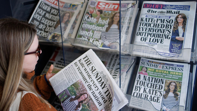 أظهرت الصحف البريطانية أميرة ويلز البريطانية كاثرين (كيت) على صفحاتها الأولى في لندن. وكشفت كاثرين عن تشخيص إصابتها بالسرطان، وهي في المراحل الأولى من تلقي العلاج الكيميائي، في بيان بتاريخ 22 مارس 2024. وحظي الخبر بتغطية إعلامية واسعة، وتعاطف شعبي كبير. وفي العادة، تهتم الصحف الشعبية في بريطانيا بحياة أفراد الأسرة المالكة، وتسلّط الضوء على أدق التفاصيل. وهذه المرة يبدو أن جميع الصحف اتفقت على خط واحد، يتمثل في الوقوف إلى جانب الأميرة المريضة، التي تحظى باحترام كبير في أوساط البريطانيين.