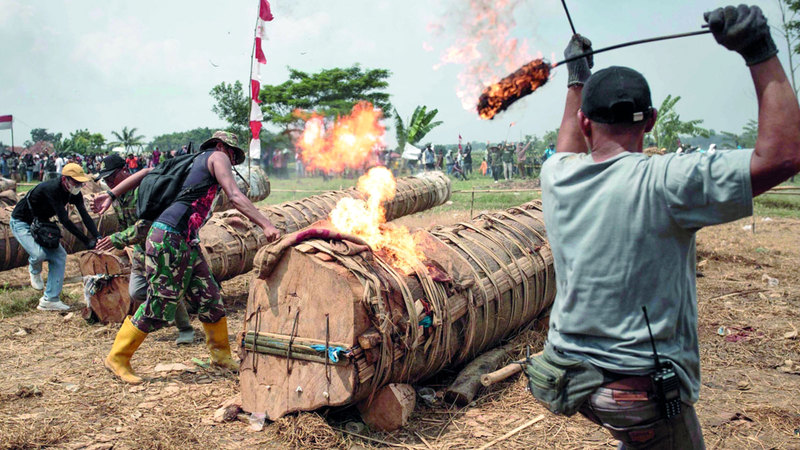 خلال إطلاق المدافع التقليدية التي تصدر دوياً قوياً ضمن مهرجان كولوونغ في جاوة الغربية. أ.ف.ب