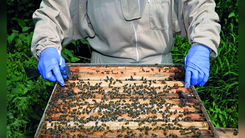 منتج العسل الطبيعي، البريطاني ليني إنغرام يتفحص خلية نحل بمنطقة ويستلي كوتيدج في إيست هتسبيل، غرب إنجلترا. بين عامي 2021 و2022، تم وصف 46% من العسل الذي تم اختباره على حدود الاتحاد الأوروبي على أنه يحتمل أن يكون مغشوشاً، مقارنة بـ14% في عام 2015، وحتى عام 2017. أسس إنغرام شبكة للعسل الأصلي في المملكة المتحدة في عام 2021، لرفع مستوى الوعي حول العسل الطبيعي والتحذير من التهديد الذي يشكله الاحتيال.