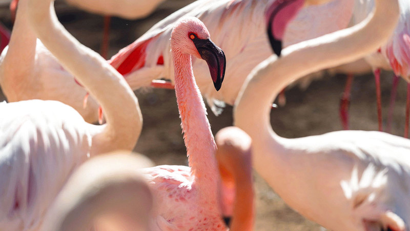 مجموعة من طيور النحام (الفلامنغو) الصغيرة في حظيرة الطيور بحديقة حيوان جوهانسبرغ، جنوب إفريقيا. وتبلغ مساحة حديقة حيوان جوهانسبرغ 55 هكتاراً، وتأسست عام 1904، وتضم نحو 2000 حيوان من 320 نوعاً. ويوجد طائر النحام الصغير في إفريقيا جنوب الصحراء الكبرى وغرب الهند. ويعمل منقار طائر الفلامنغو مثل الغربال، حيث بقوم بتصفية الكائنات الحية الدقيقة والقطع الصغيرة من الطحالب من الماء ويتغذى عليها.