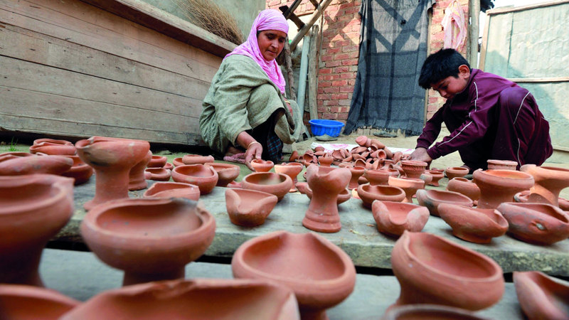أفراد من عائلة صانع الخزف الكشميري، محمد الطاف كومار، يقومون بترتيب مصابيح فخارية في ورشة منزلية لبيعها قبل مهرجان «ديوالي»، الذي يصادف 31 أكتوبر.