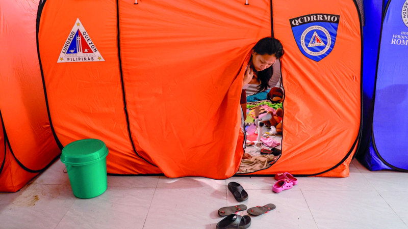 فلبينية تقيم في خيمة بمركز إيواء في كيزون، إحدى ضواحي العاصمة مانيلا، وعلقت المدارس الدراسة، وتم تذكير المواطنين باتخاذ الاحتياطات اللازمة، حيث ضرب الإعصار «توراجي»، أخيراً، منطقة شمال لوزون، ما أدى إلى هطول أمطار غزيرة ورياح مستمرة بلغت سرعتها 130 كيلومتراً في الساعة.