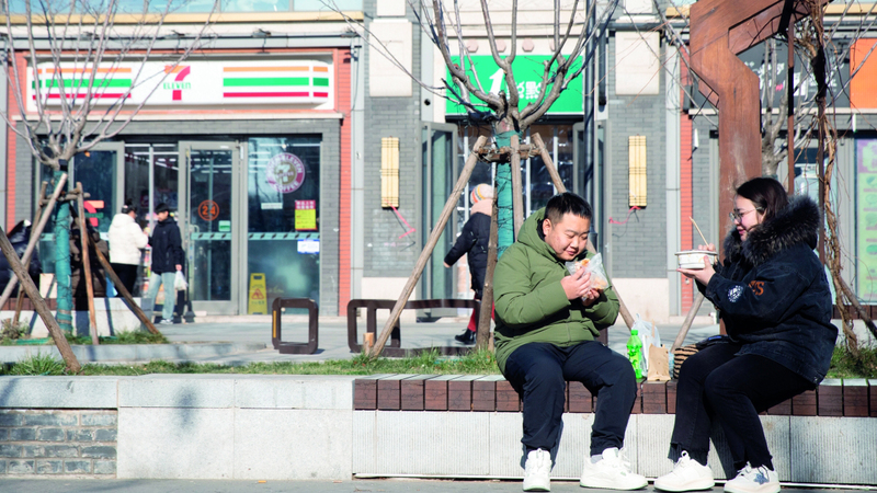 زوجان يتناولان الطعام بالقرب من ممر للمشاة في أحد شوارع بكين.