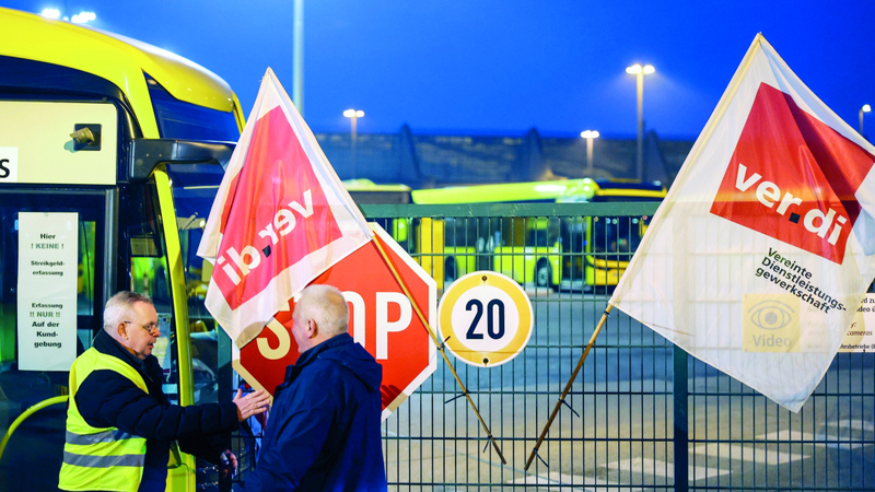 مضربون يمنعون الوصول إلى مستودع للحافلات، خلال إضراب تحذيري لمدة يوم واحد في شركة «فيردي» للنقل العام، بالعاصمة الألمانية برلين، وطلبت نقابة الشركة من أعضائها العاملين في شركة النقل العام، التي تقدّم خدمات مترو الأنفاق والحافلات والترام في برلين، الدخول في إضراب تحذيري ثانٍ لمدة 24 ساعة، بعد إضراب سابق في 27 يناير.
