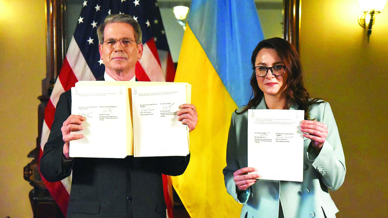 وزيرة الاقتصاد الأوكراني ووزير الخزانة الأميركي خلال التوقيع على الاتفاقية. أ.ف.ب
