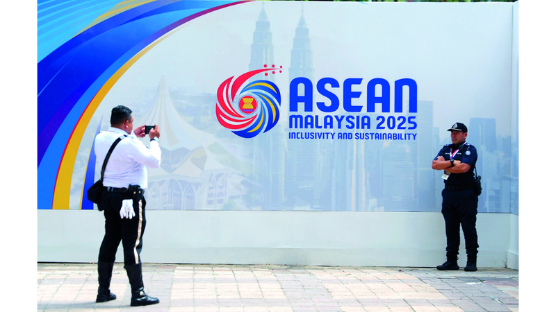 ضابط الشرطة الملكية الماليزية يلتقط صورة بالقرب من لوحة إعلانات رابطة دول جنوب شرق آسيا «آسيان»، التي عقدت قمتها في العاصمة الماليزية، كوالالمبور، أمس.