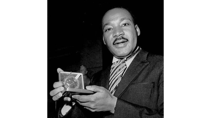 مارتن لوثر كينغ يحمل ميدالية جائزة نوبل للسلام لعام 1964 في أوسلو. أ.ب