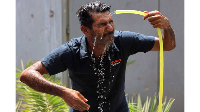رجل يغسل رأسه بالماء أثناء وقوفه في شارع الجمهورية وسط العاصمة العراقية بغداد، أول من أمس، في ظل موجة حر شديدة تمر بها البلاد، ووصلت درجات الحرارة إلى 51 درجة مئوية، وتأتي موجة الحر ضمن ذروة فصل الصيف، وتأثير امتداد منخفض حراري سطحي من شبه الجزيرة العربية، وتم التحذير من مخاطر التعرض المباشر لأشعة الشمس، خصوصاً في أوقات الذروة. أ.ف.ب