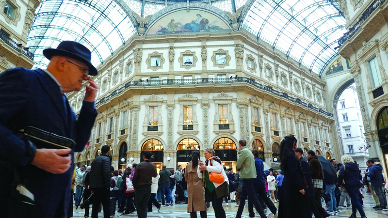 زوّار يتجوّلون في «غاليريا فيتوريو إيمانويل الثاني» بمدينة ميلانو الإيطالية، حيث يعد أقدم مركز تجاري لايزال يعمل في إيطاليا، ويُعد من أبرز المعالم السياحية الرئيسة في ميلانو، ويقع هذا المركز داخل رواق مزدوج يتألف من أربعة طوابق ويقع في قلب المدينة، وتمت تسمية «الغاليريا» تكريماً للملك فيكتور إيمانويل الثاني، الذي كان أول ملك لمملكة إيطاليا بعد توحيدها، وبدأ تصميم المركز في عام 1861، وتولى بناؤه المهندس المعماري الإيطالي، جوزيبي مينغوني، خلال الفترة الممتدة من عام 1865 حتى عام 1877.