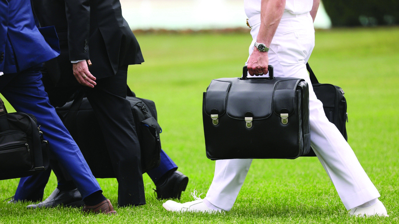 لمساعدته، يسحب مساعد عسكري قريب منه ملفاً من ثلاث أجزاء من حقيبة سوداء، ويشرح له الصفحات الملونة والمغلفة: إنها خيارات الضربة النووية.
