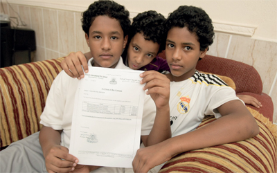 أبناء (أبوراشد) يمسكون برسالة من المدرسة تطالبهم بالرسوم المتأخـــــــــــــــــــــــــــــــــــرة. تصوير: تشاندرا بالان