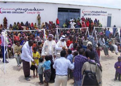 شارك رئيس وأعضاء فريق الإمارات الثاني لإغاثة النازحين الصوماليين المتضررين من الجفاف، الذي ضرب جنوب ووسط الصومال، أطفال مخيم الامارات، الذي يقع بالقرب من مطار مقديشو ويطل على المحيط الهندي ويأوي أكثر من 750 أسرة بمعدل 7 أشخاص للأسرة الواحدة، فرحتهم بعيد الفطر السعيد.
