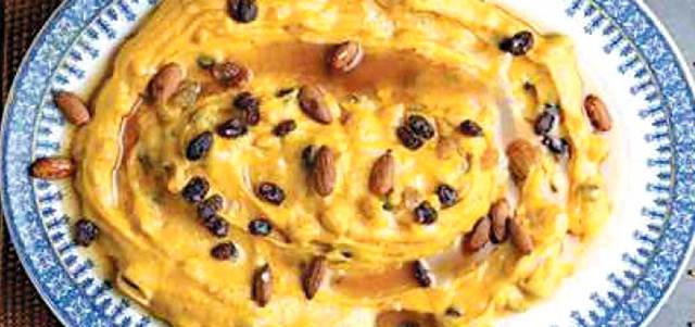 طريقة التحضير حمصي الطحين حتى يصبح لونه ذهبياً، ثم صفيه في مصفاة رفيعة جداً، للحفاظ على قوام الخليط والتخلص من حبات الطحين الخشنة التي يمكن أن تفسد العصيدة. على الجانب الآخر، قشري اليقطين واتركيه يغلي في الماء حتى يطهى، ثم صفيه. ضعي اليقطين المغلي في وعاء ساخن، ثم قومي بإضافة جزء قليل من الطحين المقلي وماء الورد والزعفران والسكر ومسحوق الهال والسمن المحلي، وحركي الخليط حتى يصبح رخواً وسهل المزج، وأضيفي بقية الطحين وحركي ببطء حتى تمتزج كل المكونات وتحصلي على القوام المطلوب للعصيدة. اخلطي جميع المكونات معاً ببطء، واتركيها تطهى على نار هادئة لمدة 15 دقيقة. نصائح الشيف يمكن استبدال المنكهات المستعملة في العصيدة (الهال والزعفران وماء الورد) بأي منكهات أخرى، مثل القرفة أو حبات القرنفل، حسب الرغبة. ينصح الشيف مصبح بالعصيدة كحلويات مرافقة لقهوة الظهيرة، أو كطبق متوازن ومغذ مناسب لفطور الصباح، لاسيما للأطفال، وذلك لقوامه الرطب الذي يجعله سهل البلع والهضم. أما في رمضان فيمكن للصائم تناوله في السحور كوجبة غنية بالسكريات والطاقة التي تساعد الجسم على مشقة ساعات الصيام الطويلة. |