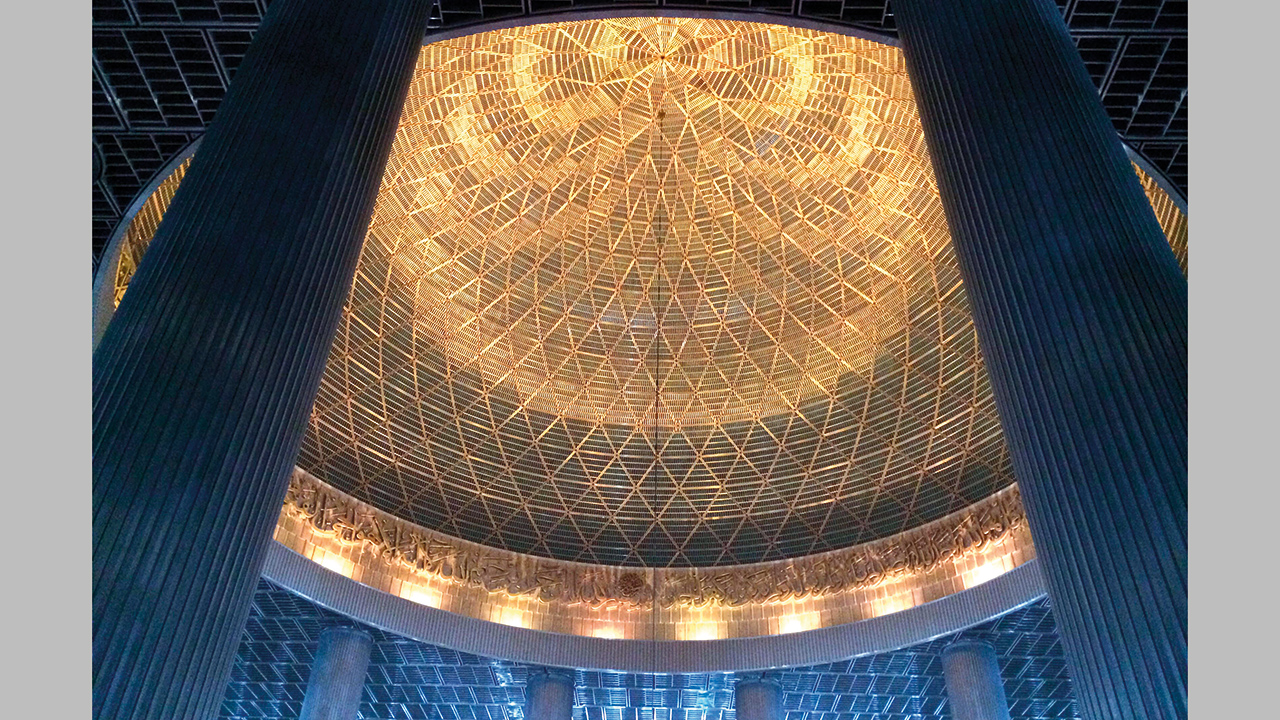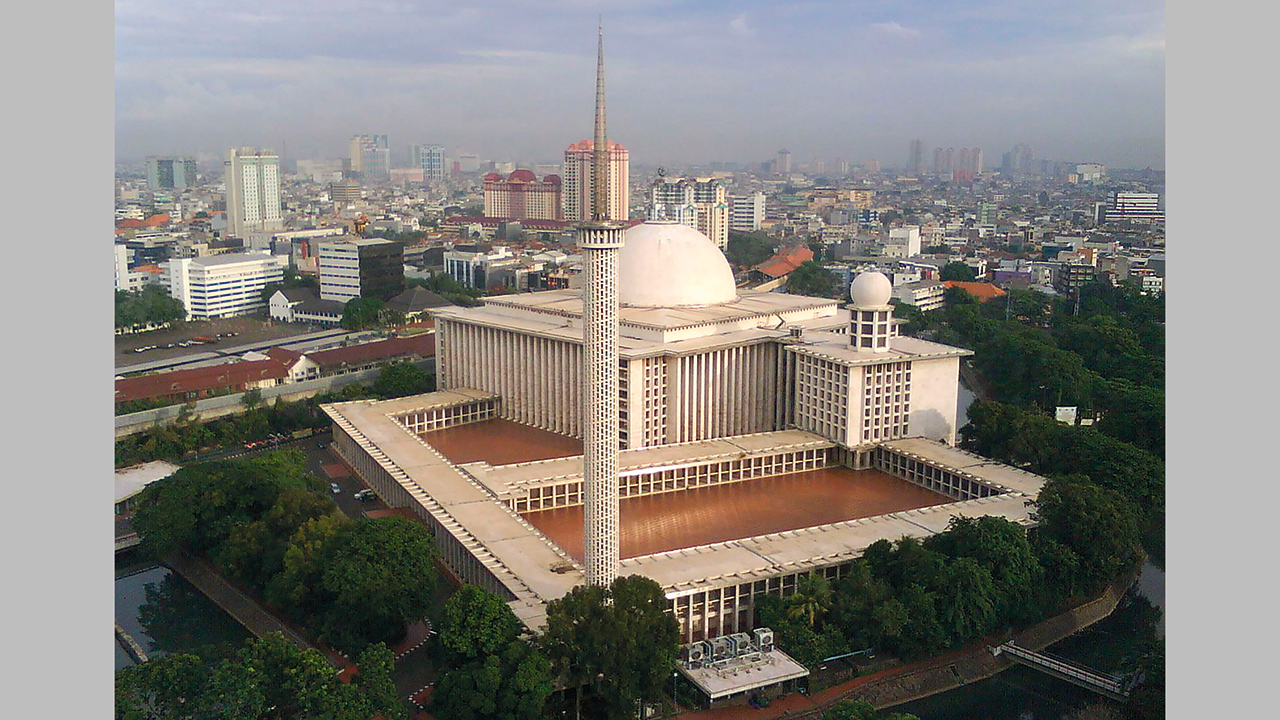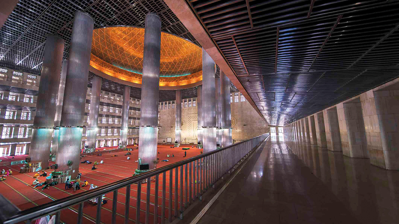 بتصميمه الحداثي الضخم، ولونه الناصع، وقبته الضخمة ومنارته الشامخة، يقف مسجد الاستقلال مهيباً محتضناً المجتمع الإندونيسي بكل أطيافه، بينما يحمل كل جزء في تصميمه رسالة ورمزاً خفياً، سواء كان دينياً أو قومياً.